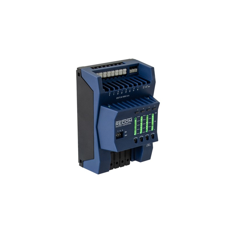 Electronic fuses with a output power of 240W. These devices have DC-OK signal, and are suitable for DIN rail mounting. We offer the following types of this Recom series: RACPRO1-4SP/24V/5A and RACPRO1-4SP/24V/10A.
