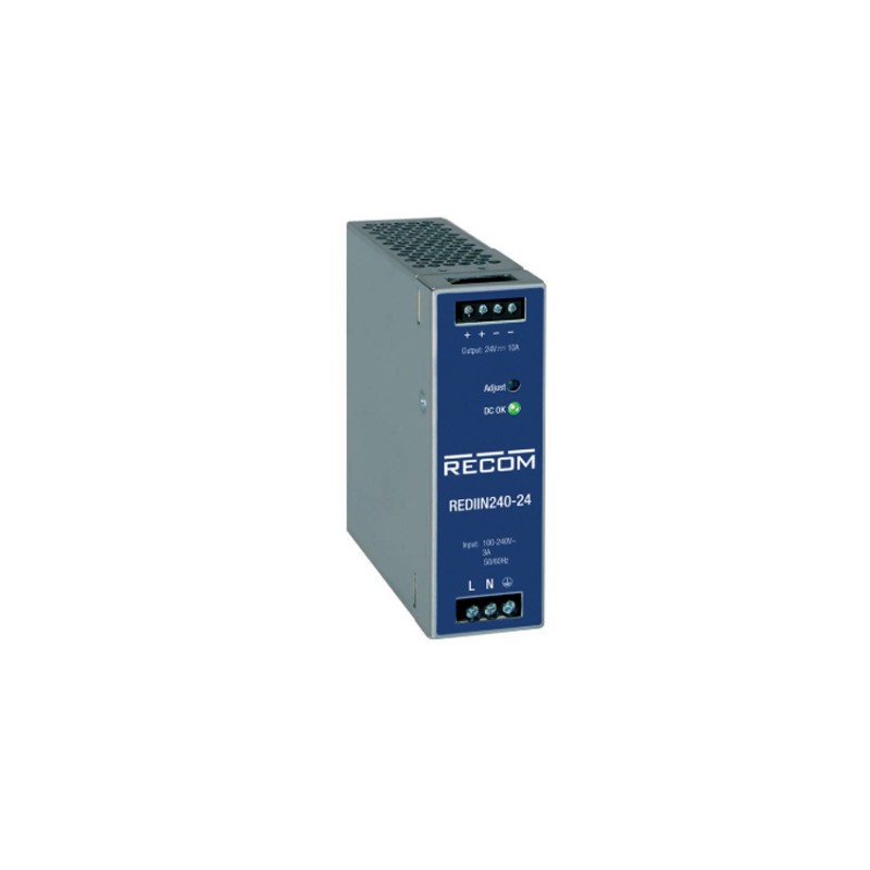 Switching power supplies in a enclosed type with 240W, a programable output voltage, and a low off-load power. These devices are suitable for DIN rail mounting, and are protected against overtemperature, overvoltge, as well as short circuit. They conform with EN55032 class B, EN 61204-3, EN 62368-1, UL 62368-1, UL 61010-1, and EN 61010-1. We offer the following types of this Recom series: REDIIN240-24 and REDIIN240-48.
