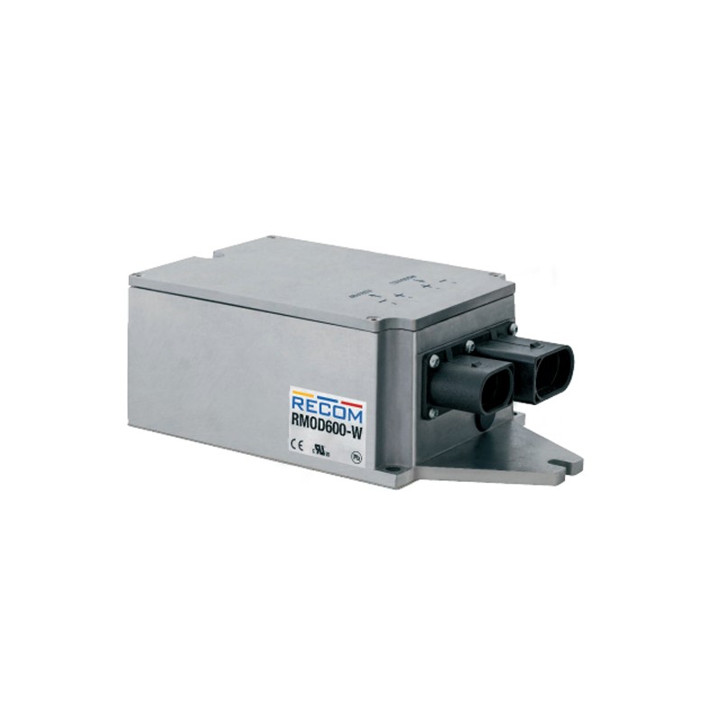 DC/DC converters in a 8"x4,53" housing, with a high power density, chassis mounting, and ground plate cooling. These devices function in parallel usage, and are woter and dust proof (IP69K). They are protected against over load,over temperature, and short circuit. We offer the RMOD600-60-24SW type of this Recom series.