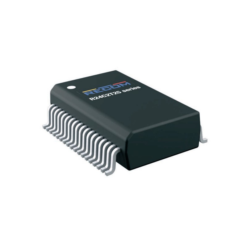 DC/DC converter modules in a 36-pin SSOP SMD housing with 2W, a programmable output voltage and two output channels. These devices are suitable for direct PCB mounting, have a high 3kVAC/1min isolation and are protected against overload, overtemperature as well as short circuit. They have a low isolation capacitance of 3,5pF and comply with EN62368-1 as well as EN60112. We offer the type R24C2T25-CT of this Recom series.