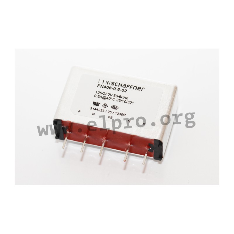 Single-phase RFI filters in an aluminium housing with a very low profile. These line filters are suitable for PCB mounting and comply with EN60939. We offer the following types of this Schaffner series: FN406-0.5-02, FN406-1-02, FN406-3-02, FN406-6-02, FN406-8.4-02, FN406B-0.5-02, FN406B-1-02, FN406B-3-02, FN406B-6-02, and FN406B-8.4-02.
