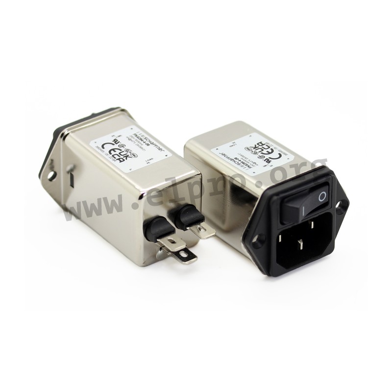 RFI filters in a metal housing with a 2-pole rocker switch, an IEC plug and a faston connector (6,3x0,8mm). These line filters have a good attenuation and mounting flanges. We offer the following types of this Schaffner series: FN9264-1-06, FN9264-2-06, FN9264-4-06, FN9264-6-06, FN9264-10-06, FN9264B-1-06, FN9264B-2-06, FN9264B-4-06, FN9264B-6-06, and FN9264B-10-06.