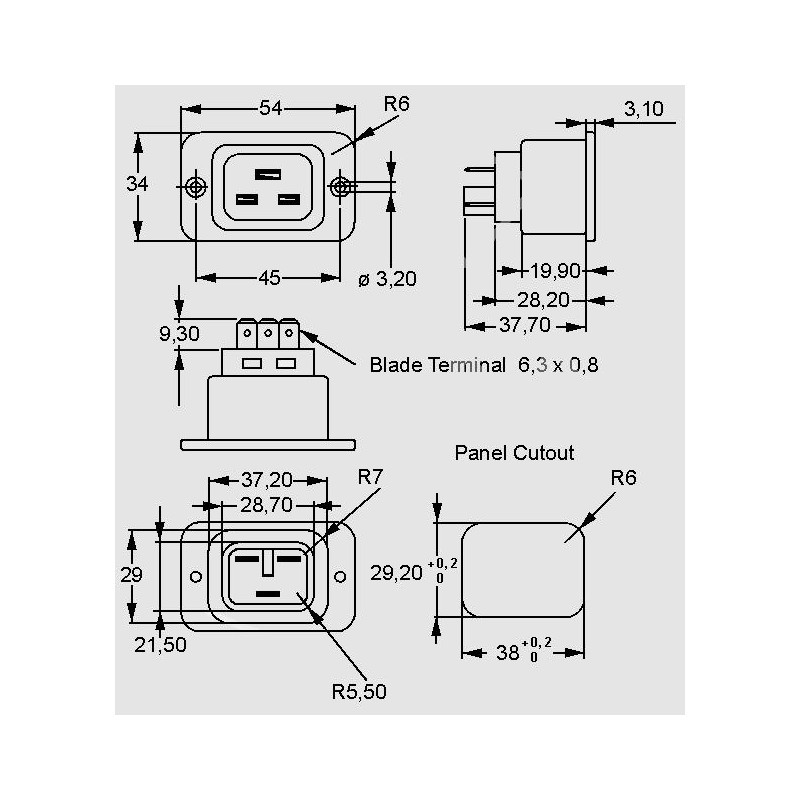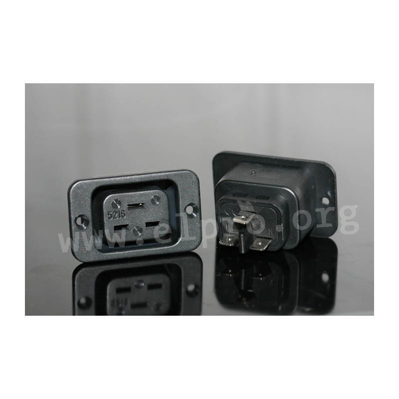 • no. of poles: 2 + PE• by Schurter• continuous current: 16A• pin temperature: 70°C• rated voltage: 250V AC• connection by flat cable plug 6.3mm• black• with longitudinal flange, distance between holes 45mm