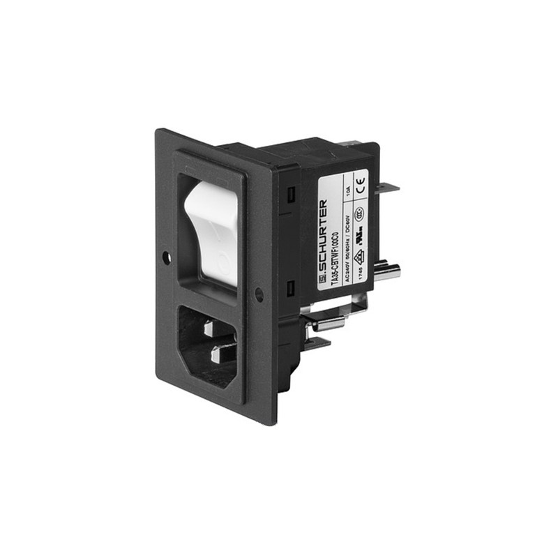 IEC appliance inlets C14 or C18 in black or white made of thermoplastic (UL94V-0) and with a circuit breaker TA-35, 2 poles. They are suitable for screw-on or snap-in mounting (3-107-924/3-109-713/3-109-716), and have a tab terminal 6,3x0,8mm. These inlets are compliant with IP40 resp. IP67 (3-108-454/3-109-719). We offer various types of this Schuter series.