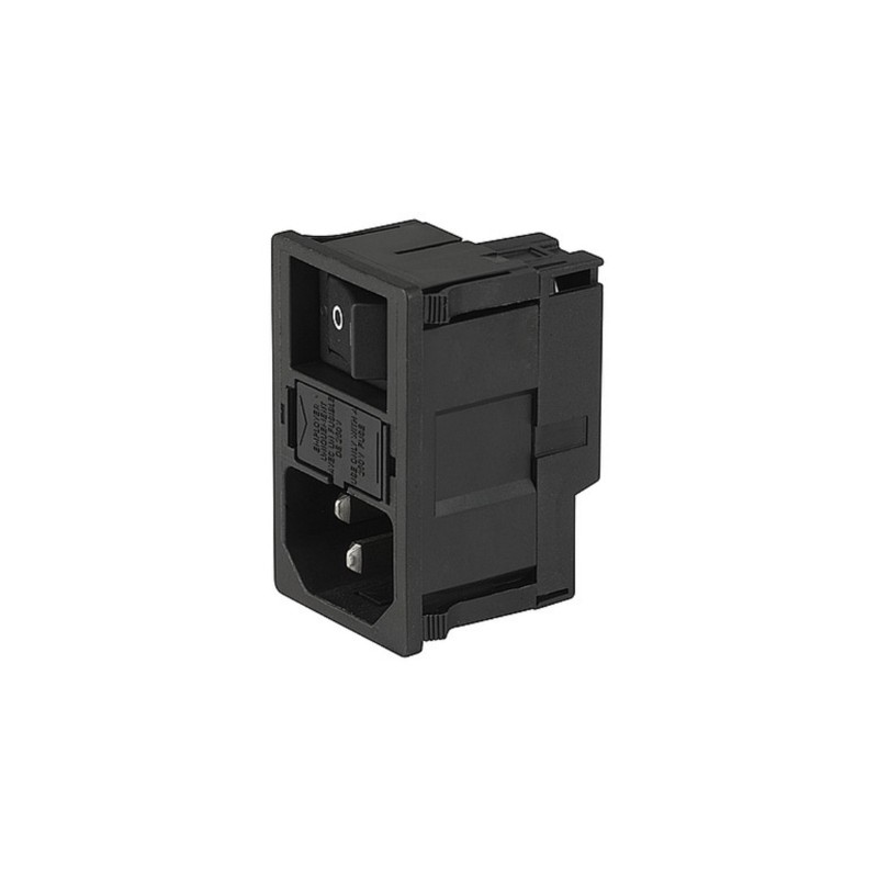 IEC insert connectors C14 with a 2-pole rocker switch and a 2-pole fuse holder for two fuses (5x20mm), with matching fuse drawers available. They are suitable for snap-in mounting, have a tab terminal (4,8x0,8mm), and are available with EMC shielding (KM01.1105.11). We offer various types of this Schuter series.