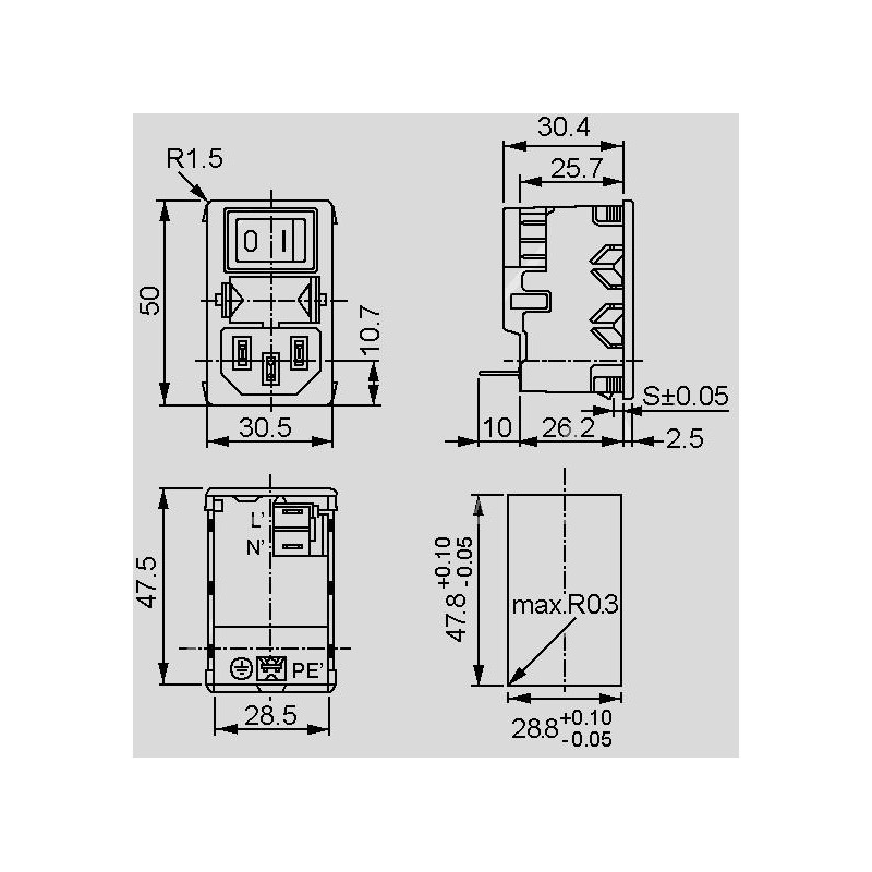 • combination consists if appliance plug, 2-pole black, rocker switch (not illuminated) and 2-pole fuse holder for two fuse links (5x20mm)(use drawer 4301.1401 must be ordered separately)
