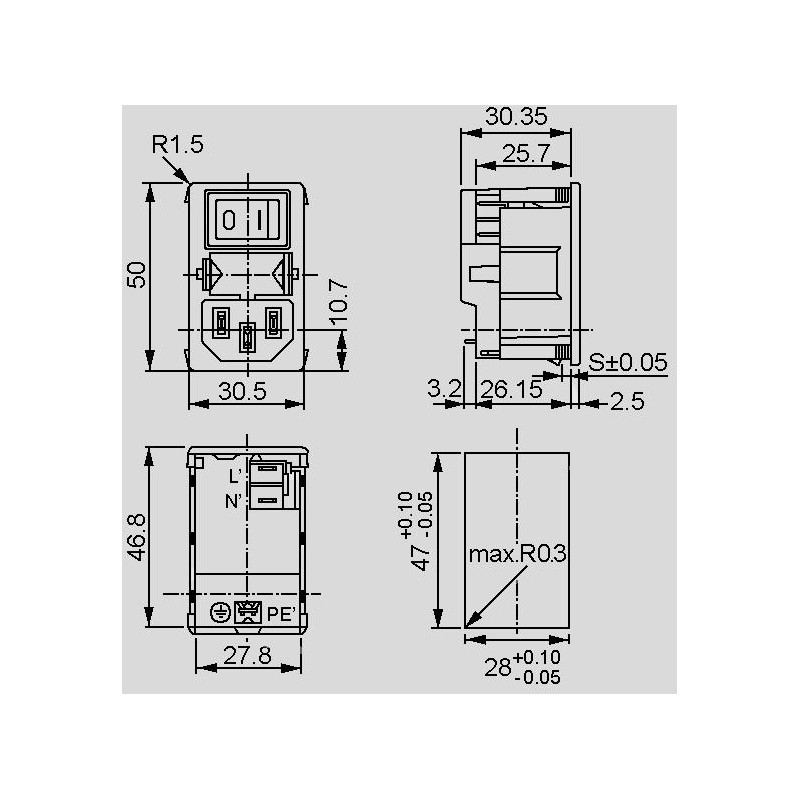 • combination consists if appliance plug, 2-pole black, rocker switch (not illuminated) and 2-pole fuse holder for two fuse links (5x20mm)(use drawer 4301.1401 must be ordered separately)