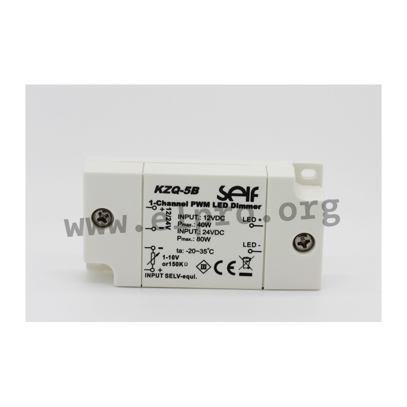 PWM dimming controllers in a plastic housing (IP20) with 80W and a constant voltage. These devices are suitable for 12V or 24V single colour LEDs and are protected against overload, overvoltage as well as short circuit. The dimming is controlled by a 1 to 10V interface or a 150kOhm potentiometer. We offer the type KZQ-5B of this Self series.