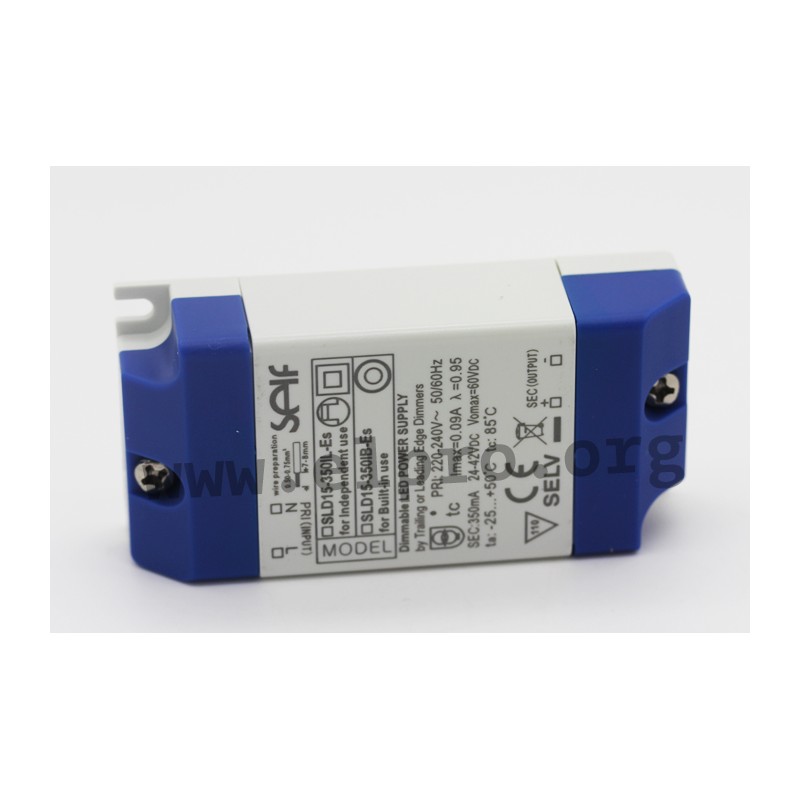 Flickerfree LED drivers in a plastic housing (IP20) with 15W, a constant current and protection class II. These SELV compliant devices are suitable for LED lighting applications and are protected against overload, overvoltage, overtemperature as well as short circuit. They are dimmable and comply with EN55015, EN61347-1 as well as EN61347-2-13. We offer the following types of this Self series: SLD15-300IL-ES, SLD15-350IL-ES, SLD15-500IL-ES and SLD15-700IL-ES.