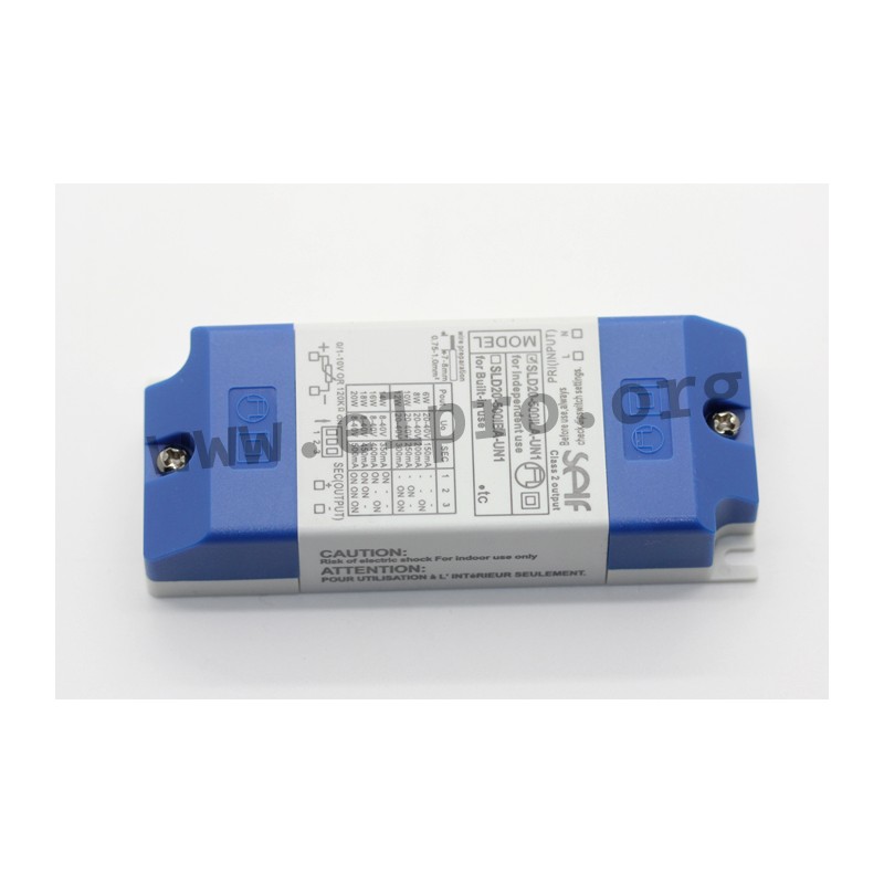 Flickerfree LED drivers in a plastic housing (IP20) with 20W, a constant current (selectable through a DIL switch) and protection class II. These SELV compliant devices have a dimming function (1 to 10V) and are protected against short circuit, overload, overvoltage as well as overtemperature. They are suitable for LED lighting applications and comply with EN61347-1, EN61347-2-13, EN55015 as well as EN61000-3-2. We offer the type SLD20-500ILA-UN1 of this Self series.