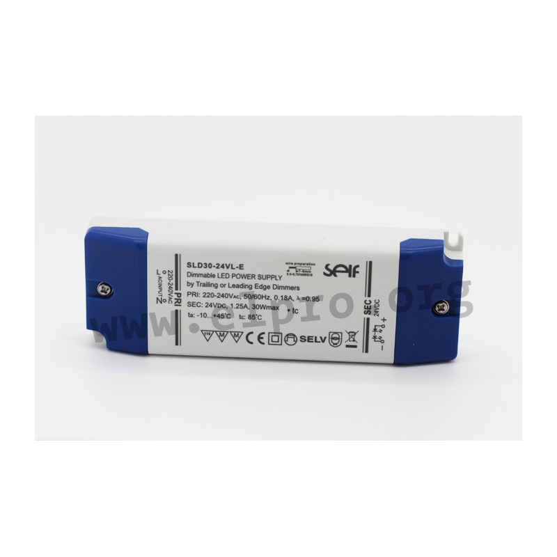 Flickerfree LED drivers in a plastic housing (IP20) with 30W, a constant current and protection class II. These SELV compliant devices have a TRIAC dimmer (phase-cut dimmer) and are protected against overload, overtemperature, short circuit as well as overvoltage. They are suitable for LED lighting applications and comply with EN55015, EN61347-1 as well as EN61347-2-13. We offer the following types of this Self series: SLT30-12VL-E and SLT30-24VL-E.