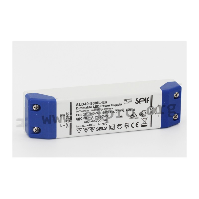 Flickerfree LED drivers in a plastic housing (IP20) with 40W, a constant current and protection class II. These SELV compliant devices are dimmable and are protected against overload, overtemperature, short circuit as well as overvoltage. They are suitable for LED lighting applications and comply with EN55015, EN61347-1 as well as EN61347-2-13. We offer the following types of this Self series: SLD40-700IL-ES, SLD40-800IL-ES, SLD40-900IL-ES and SLD40-1050IL-ES.