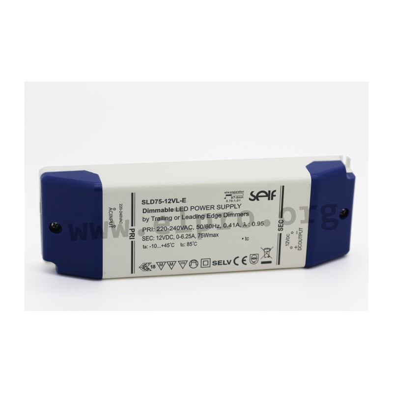 Flickerfree LED drivers in a plastic housing (IP20) with 75W, a constant voltage and protection class II. These SELV compliant devices have a TRIAC dimmer (phase-cut dimmers) and are protected against overload, overtemperature, overvoltage as well as short circuit. They are suitable for LED lighting applications and comply with EN55015, EN61347-1, EN61347-2-13 as well as EN61000-3-2. We offer the following types of this Self series: SLD75-12VL-E and SLD75-24VL-E.