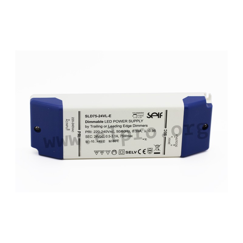 Flickerfree LED drivers in a plastic housing (IP20) with 75W, a constant voltage and protection class II. These SELV compliant devices have a TRIAC dimmer (phase-cut dimmers) and are protected against overload, overtemperature, overvoltage as well as short circuit. They are suitable for LED lighting applications and comply with EN55015, EN61347-1, EN61347-2-13 as well as EN61000-3-2. We offer the following types of this Self series: SLD75-12VL-E and SLD75-24VL-E.