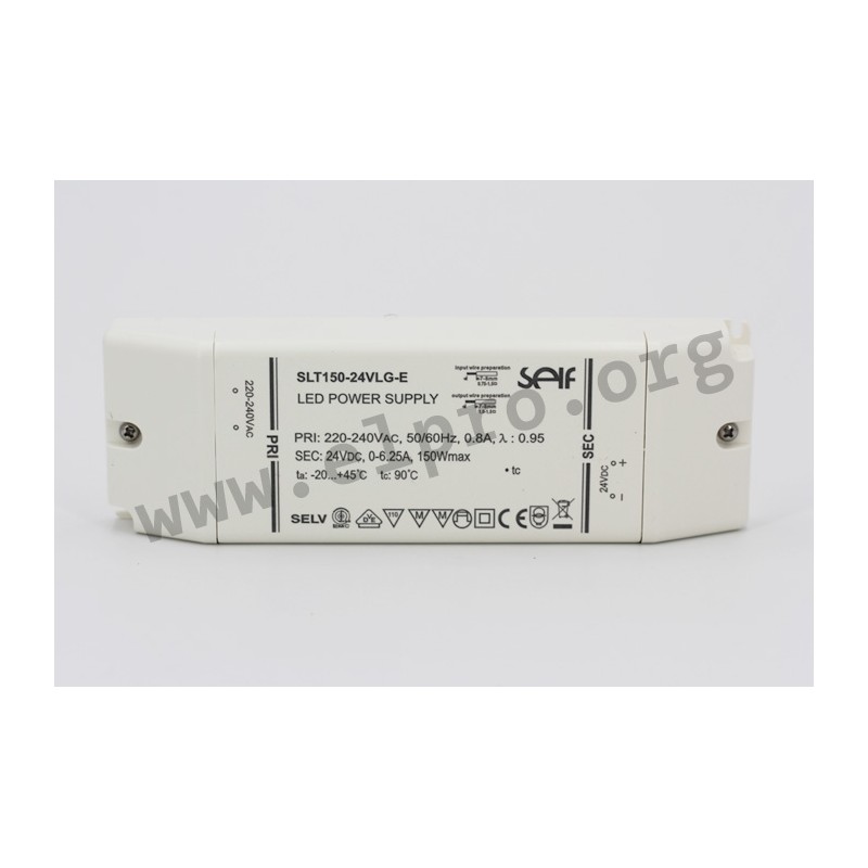 LED drivers in a plastic case (IP20) with 150W, a constant voltage and protection class II. These devices are suitable for LED lighting applications and are protected against overload, short circuit, overvoltage as well as overtemperature. They are not dimmable and comply with EN61347-1, EN61347-2-13 as well as EN55015. We offer the following types of this Self series: SLT150-24VLG-E and SLT150-48VLG-E.