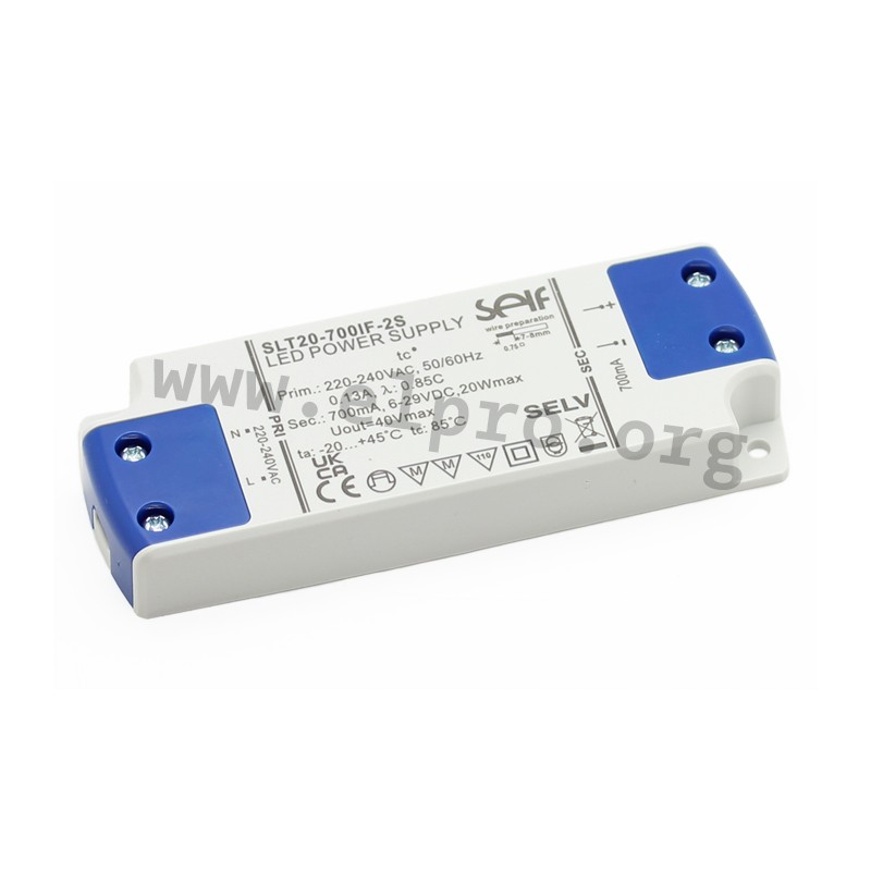 LED drivers in a plastic housing (IP20) with 20W, protection class II and a constant current. These SELV compliant devices are suitable for LED lighting applications and are protected against overload, overtemperature, short circuit as well as overvoltage. They are not dimmable and comply with EN61347-1, EN61347-2-13 as well as EN55015. We offer the following types of this Self series: SLT20-350IF-2S and SLT20-700IF-2S.