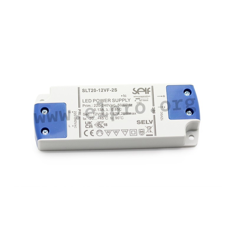 LED drivers in a plastic housing (IP20) with 20W, protection class II and a constant current. These SELV compliant devices are suitable for LED lighting applications and are protected against overload, overtemperature, short circuit as well as overvoltage. They are not dimmable and comply with EN61347-1, EN61347-2-13 as well as EN55015. We offer the following types of this Self series: SLT20-12VF-2S and SLT20-24VF-2S.
