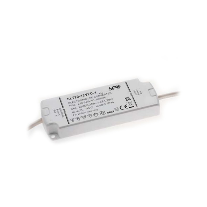 LED drivers in a plastic housing (IP44) with 20W, a constant voltage (CV) and protection class II. These SELV compliant devices are protected against overload, overvoltage, overtemperature as well as short circuit and are not dimmable. They are suitable for LED lighting applications and comply with EN61347-1, EN61347-2-13 as well as EN55015. We offer the following types of this Self series: SLT20-12VFC-1 and SLT20-24VFC-1.