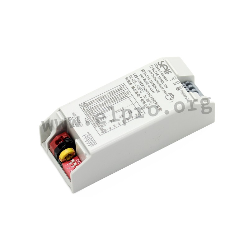 LED drivers in a plastic housing (IP20) with 35W, a constant current, protection class II and a selectable output current. These SELV compliant devices are suitable for LED lighting applications and are protected against short circuit, overload as well as overtemperature. They are not dimmable and comply with EN61347-1, EN61347-2-13, UL1310 as well as EN55015. We offer the type SLT35-1000IB-UN as well as matching end panels 1099-013114-0130 (set of two) of this Self series.