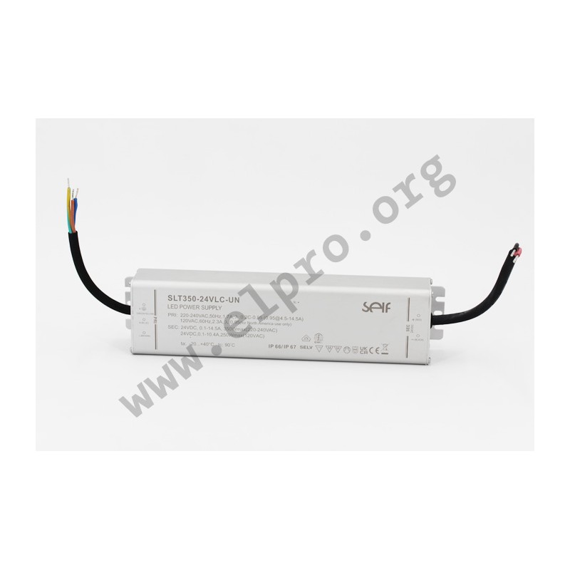 LED drivers in a metal housing (IP67) with 30W, a constant voltage and protection class I. These SELV compliant devices are not dimmable and are protected against overload, overtemperature, overvoltage as well as short circuit. They are suitable for LED lighting applications and comply with EN60335-1, EN61347-1, EN61347-2-13 as well as EN55015. We offer the following types of this Self series: SLT350-24VLC-UN and SLT350-48VLC-UN.