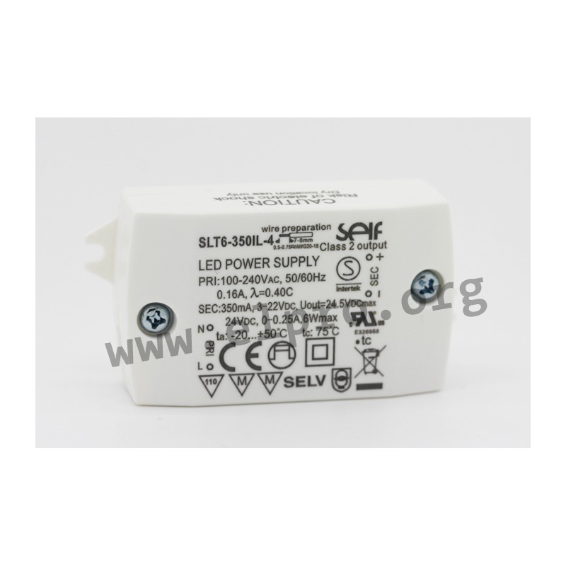 LED drivers in a plastic housing (IP20) with 6W, protection class II, a constant current and a constant voltage. These SELV compliant devices are suitable for LED lighting applications and are protected against overload, overvoltage, overtemperature as well as short circuit. They are not dimmable and comply with EN55015, EN61347-1, EN61347-2-13, UL1310 as well as UL8750. We offer the following types of this Self series: SLT6-350IL-4, SLT6-500IL-4 and SLT6-700IL-4.