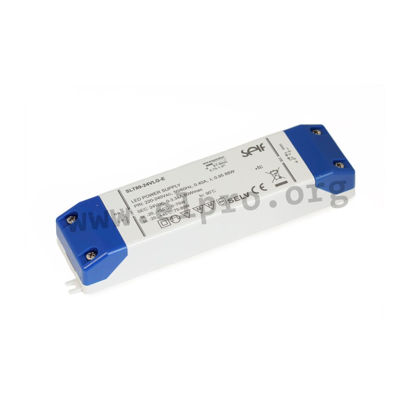 LED drivers in a plastic housing (IP20) with 80W, a constant voltage, a low no-load power (<0,5W) and protection class II. These SELV compliant devices are suitable for LED lighting applications and are protected against overload, overtemperature, short circuit as well as overvoltage. They are not dimmable and comply with EN61347-1, EN61347-2-13 as well as EN55015. We offer the type SLT80-24VLG-E of this Self series.