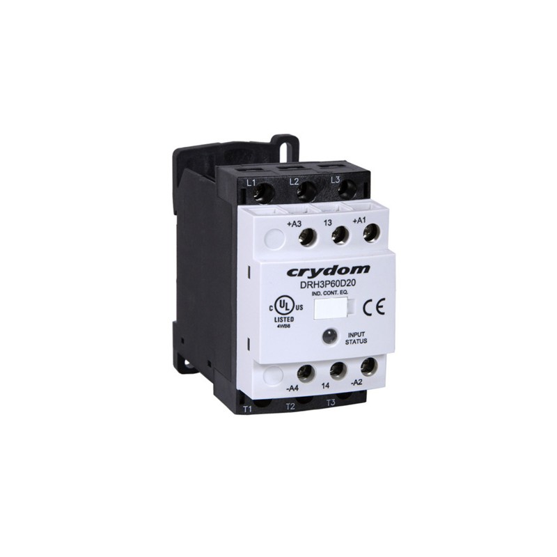 These electronic solid state relais are suitable for switching voltage and have a thyristor output. Their housing can be mounted direktly onto the DIN-rail, and they are equipped with zero crossing circuits. We offer the following types of this Sensata/Crydom series: DRH3P60A18 and DRH3P60D20.