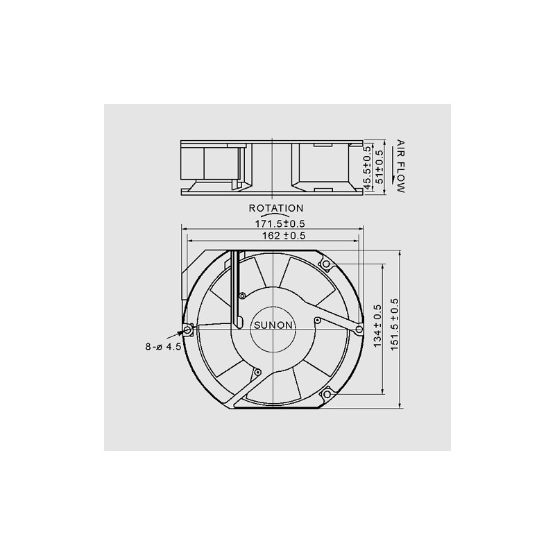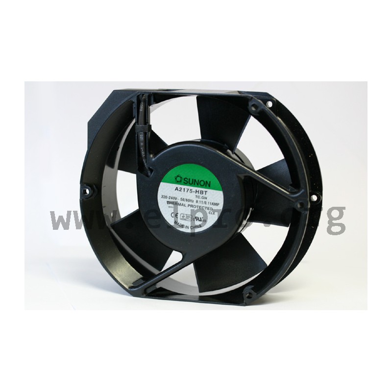 AC fans with ball bearings and dimensions of 172x151x51mm are produced by Sunon. They feature an alveolate motor that is thermal protected, as well as a frame made from aluminium spray cast. The impeller is filled with thermoplastic PBT (UL94V-0). These fans come in two connection types: _HBT-TC, which has an integrated terminal plug measuring 2.8x0.3mm; and _HBL-TC, which uses AWG18 UL1007 stripped tinned connections. Rated voltage for these AC fans ranges between 220 to 240V at a frequency of either 50 or 60Hz while their operating voltage lies within the range of 150 to250 VAC. The dielectric strength at 65% humidity is rated at 1500V AC/1min whereas insulation resistance measures greater than500MΩ when tested using 500V DC. These AC Fans have been designed to operate under temperatures ranging from -10°C up to +70°C and reversible temperature protection set points are fixedat 110°C/90°C respectively ensuring safe operation even during high ambient conditions.