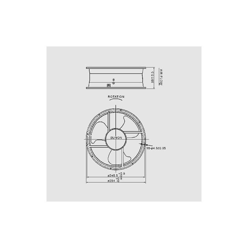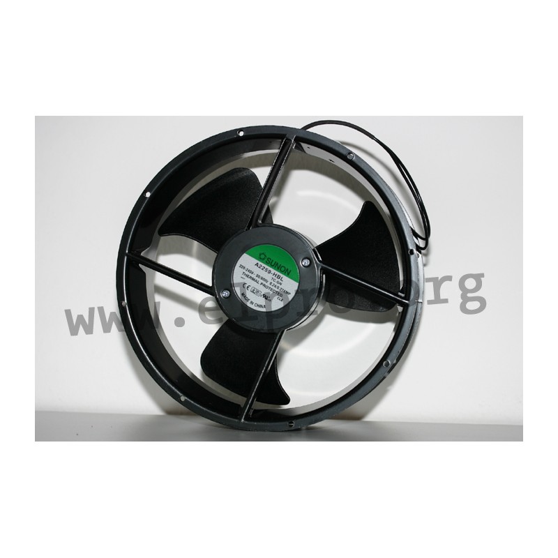AC fans with a ball bearing system and dimensions of Ø254x89mm by Sunon are designed for efficient cooling in various applications. These fans feature an alveolate motor that is thermal protected, ensuring safe operation even under high temperatures. The frame is made of aluminium spray cast material, providing durability and resistance to corrosion. The impeller is made of filled thermoplastic PBT (UL94V-0), which makes it resistant to heat and flame. The connection type varies depending on the model: A2259HBL-TC has an integrated terminal plug (2.8x0.3mm) while A2259HBT-TC uses AWG20 UL 1015 stripped tinned wires for easy installation. These AC fans have a rated voltage of 220 to 240V AC at 50/60Hz, but can operate within a range of 150 to 250V AC without any issues due to their dielectric strength of up to 1800V AC for one minute at a relative humidity of 65%.