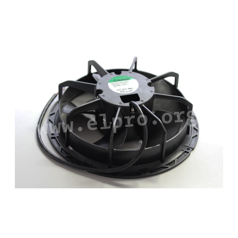 AC fans with a patented one-phase single coil DC brushless motor design. The frame and impeller of these fans are made of thermoplastic PBT (UL94V-0). These fans have ball bearing systems, dimensions of Ø200.6x77.7mm, and connection type UL SVT 18AWGx3C, 105°C, 300V. They have different protection classes: IP68 for the CF 2207 LBL-000U-HE9 model and IP55 for the CF 2207 LBL-000U-HB9 model. Their rated voltage is between 220 to 240V AC while their operating voltage ranges from 185 to 250V AC. We offer the following types of this Sunon series: CF 2207 LBL-000U-HE9 and CF 2207 LBL-000U-HB9