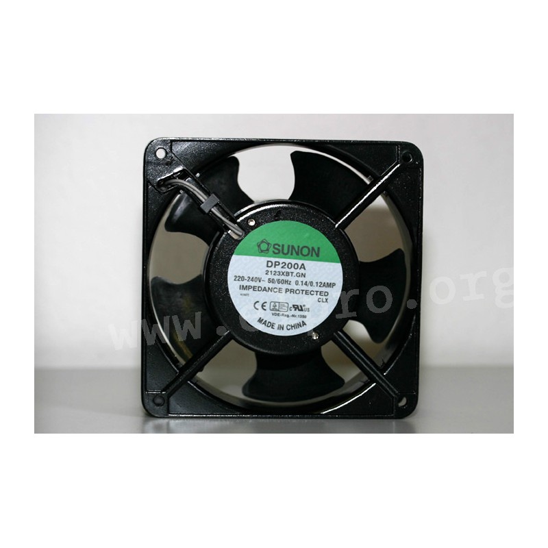 AC fans with a diecast aluminium frame and an impedance protected shaded-pole motor. These fans feature impellers made of thermoplastic PBT (UL94V-0) and can operate in temperatures ranging from -10 to +70°C. With dimensions of 120x120x38mm, they have a rated voltage of 115V AC (SP_) resp. 15/230V AC (SF_)