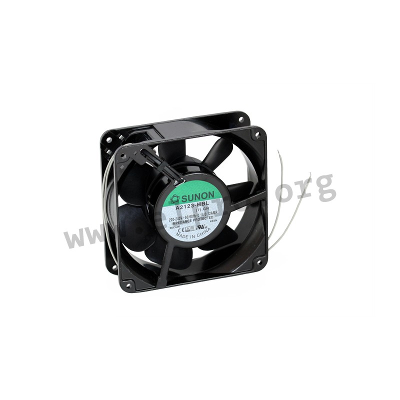 AC fans with a diecast aluminium frame and an impedance protected shaded-pole motor. These fans feature impellers made of thermoplastic PBT (UL94V-0) and can operate in temperatures ranging from -10 to +70°C. With dimensions of 120x120x38mm, they have a rated voltage of 115V AC (SP_) resp. 15/230V AC (SF_)
