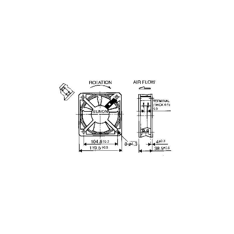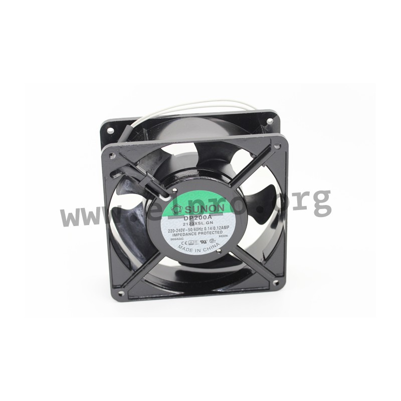 AC fans with a diecast aluminium frame and an impedance protected shaded-pole motor. These fans feature impellers made of thermoplastic PBT (UL94V-0) and can operate in temperatures ranging from -10 to +70°C. With dimensions of 120x120x38mm, they have a rated voltage of 115V AC (SP_) resp. 15/230V AC (SF_)