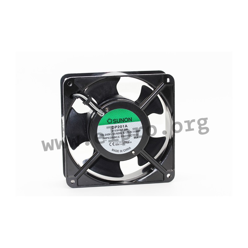 AC fans with a diecast aluminium frame and an impedance protected shaded-pole motor. These fans feature impellers made of thermoplastic PBT (UL94V-0) and can operate in temperatures ranging from -10 to +70°C. With dimensions of 120x120x38mm, they have a rated voltage of 115V AC (SP_) resp. 15/230V AC (SF_)