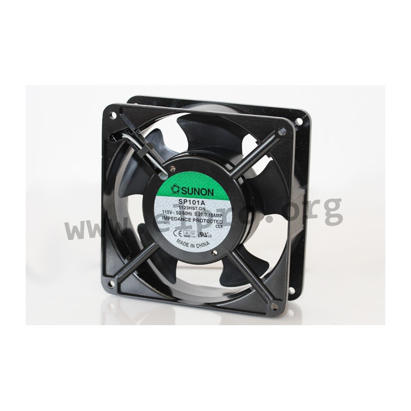 AC fans with a diecast aluminium frame and an impedance protected shaded-pole motor. These fans feature impellers made of thermoplastic PBT (UL94V-0) and can operate in temperatures ranging from -10 to +70°C. With dimensions of 120x120x38mm, they have a rated voltage of 115V AC (SP_) resp. 15/230V AC (SF_)