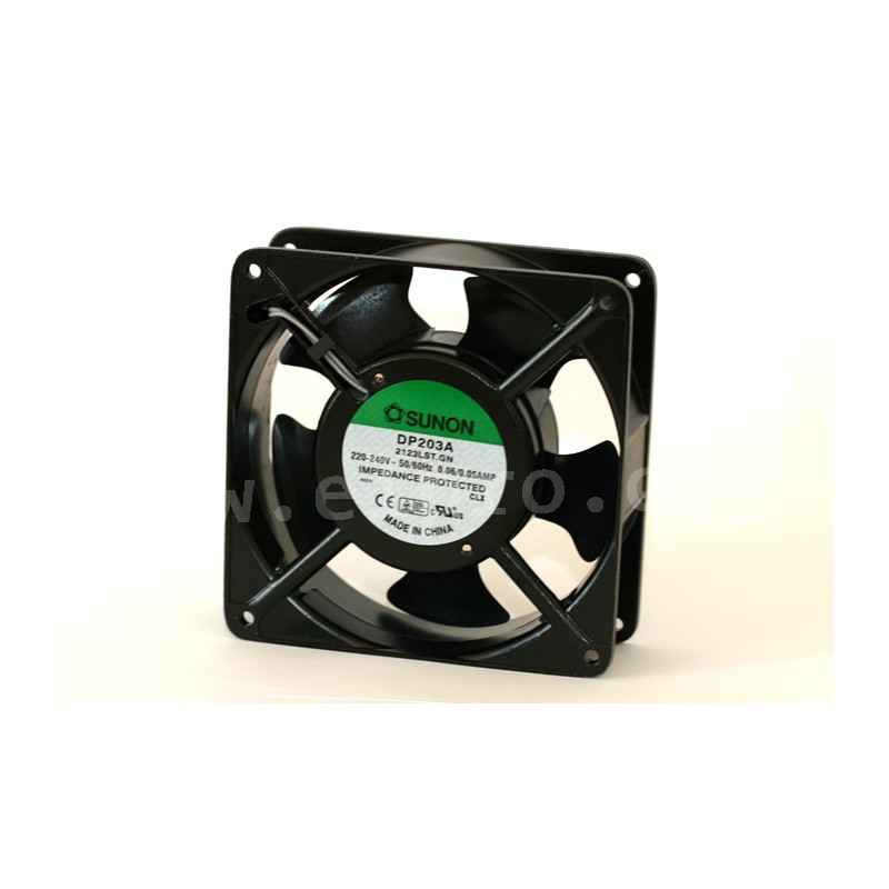 AC fans with a diecast aluminium frame and an impedance protected shaded-pole motor. These fans feature impellers made of thermoplastic PBT (UL94V-0) and can operate in temperatures ranging from -10 to +70°C. With dimensions of 120x120x38mm, they have a rated voltage of 115V AC (SP_) resp. 15/230V AC (SF_)