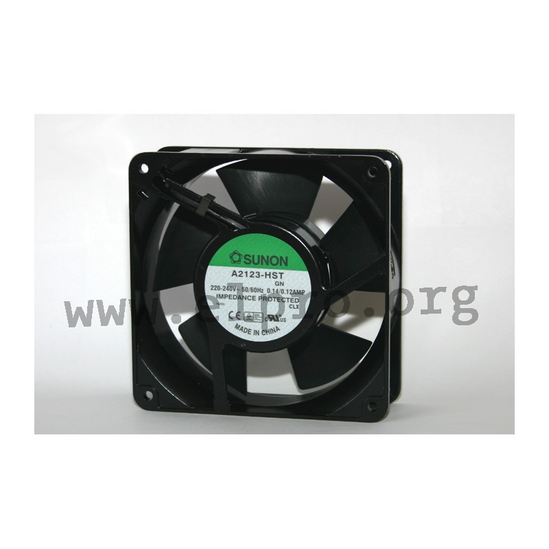 AC fans with a diecast aluminium frame and an impedance protected shaded-pole motor. These fans feature impellers made of thermoplastic PBT (UL94V-0) and can operate in temperatures ranging from -10 to +70°C. With dimensions of 120x120x38mm, they have a rated voltage of 115V AC (SP_) resp. 15/230V AC (SF_)