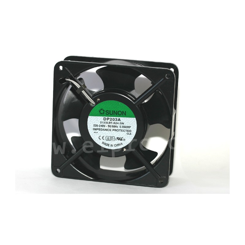 AC fans with a diecast aluminium frame and an impedance protected shaded-pole motor. These fans feature impellers made of thermoplastic PBT (UL94V-0) and can operate in temperatures ranging from -10 to +70°C. With dimensions of 120x120x38mm, they have a rated voltage of 115V AC (SP_) resp. 15/230V AC (SF_)