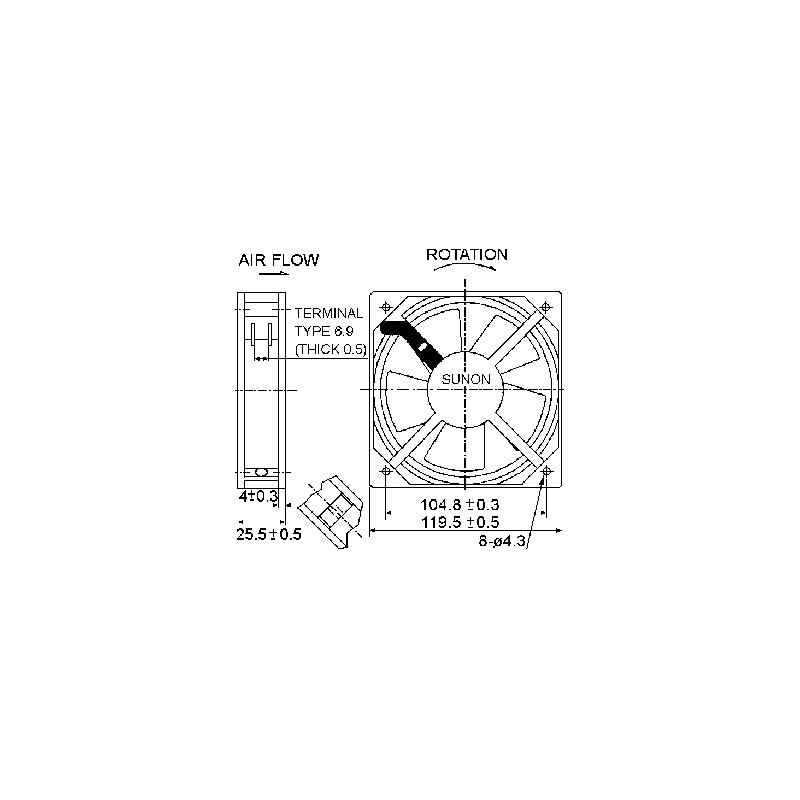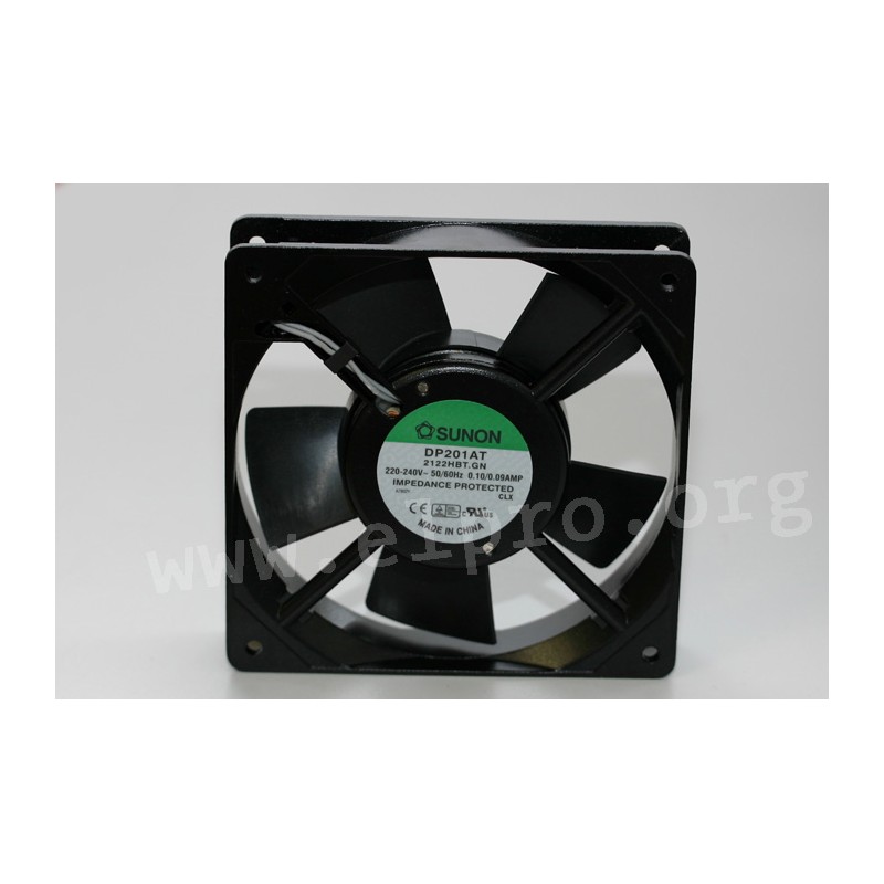 AC fans with diecast aluminium frames, shaded-pole motors and impedance protection are available in sleeve bearing (LFD 220V G / DP_HS_) or ball bearing systems (LFD 220V K / DP_HB_ / DP_LB_). These fans feature impellers made of thermoplastic PBT (UL94V-0) and connection through a tab terminal measuring 2.8x0.3mm. They can operate under temperatures ranging from -10 to +70°C and have dimensions of 120x120x25mm while being rated at a voltage of 230V AC.