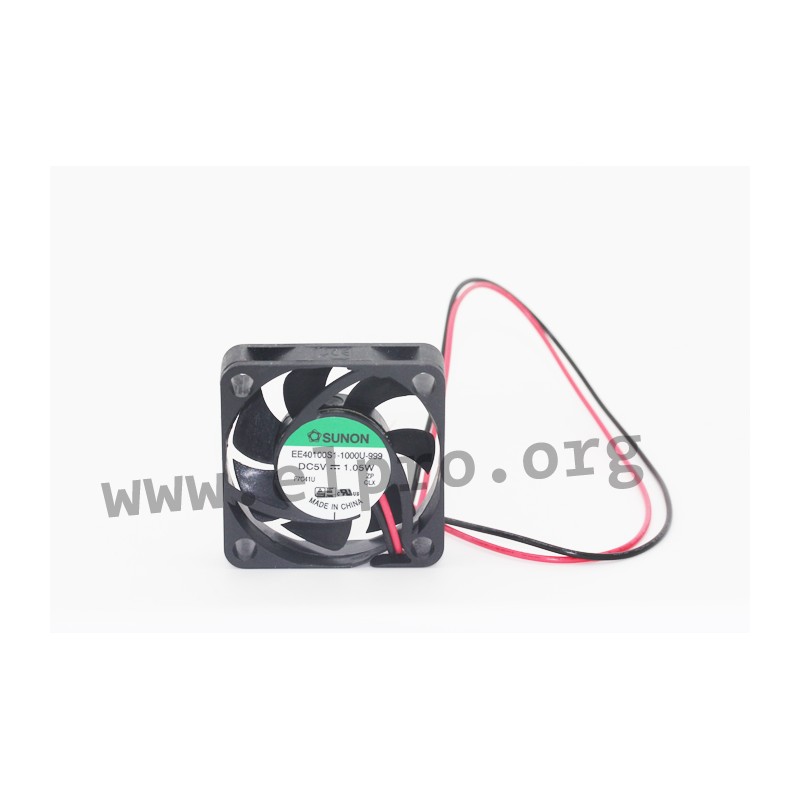 DC axial fans with dimensions of 40x40x10mm and an operating voltage of 5V DC, available as a four-pole version with the option to choose between sleeve bearings (EE_) or vapor bearings (MF_). The impeller and frame are made from filled thermoplastic UL94V-0 and feature a magnetic levitation system. They are connected through AWG26 gauge wires for easy installation.