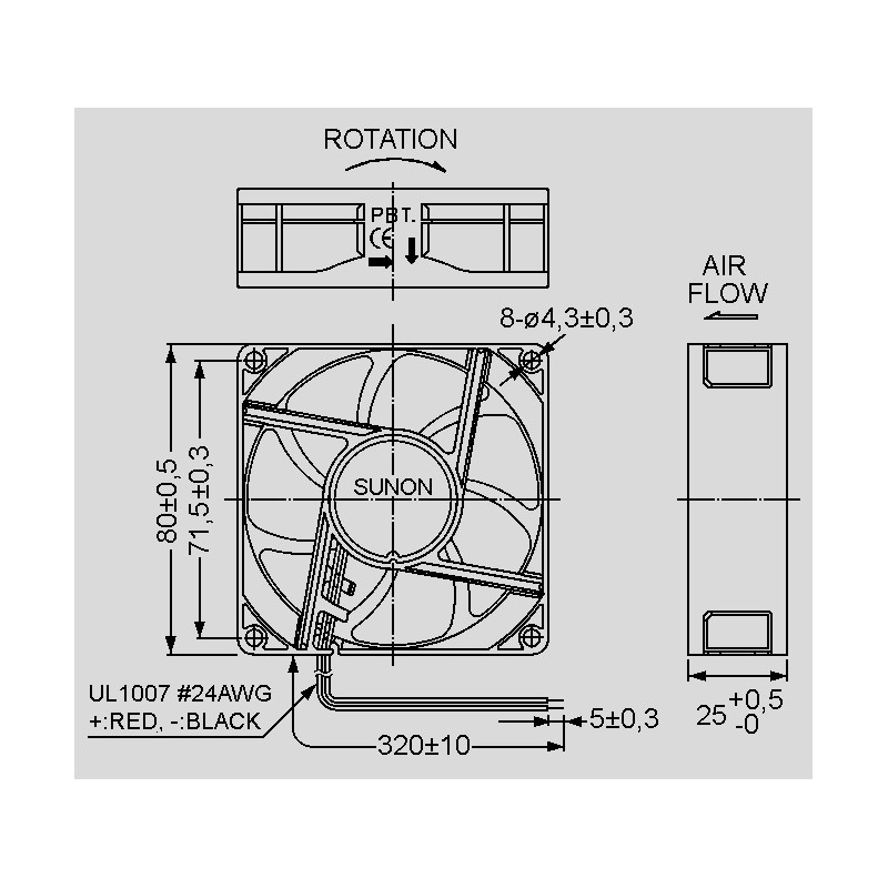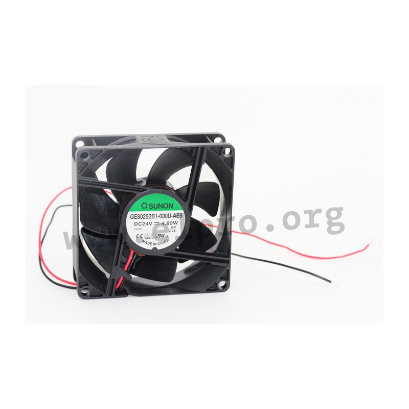 Four-pole DC fans with a 4-pole brushless DC motor and a ball bearing (EE_B), a sleeve bearing (EE_S), a vapo bearing (ME_/MF_) or a two ball bearing (GE 80252_) system. These fans are partly designed as one-phase single coil DC brushless motors (EF_/MF_) and have an impeller and frame made of thermoplastic PBT (UL94V-0). The connection is through wires UL1007 AWG24 that are stripped and tinned. They have insulation class A with dimensions of 80x80x25mm. Rated voltage for these fans is at 24VDC.