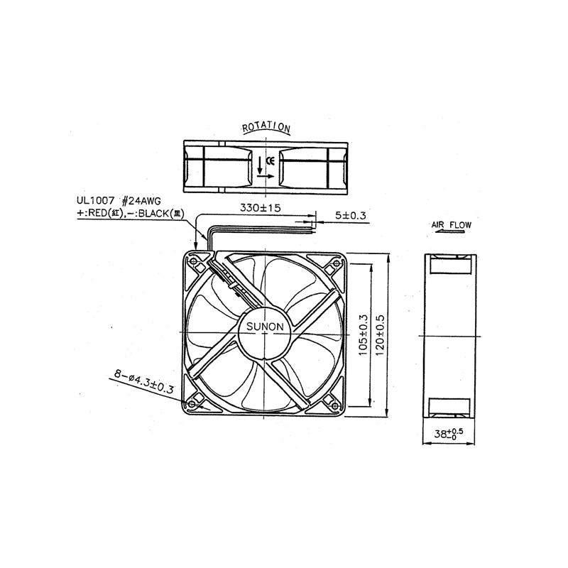 DC fans in a 120x120x38mm housing. These fans have a ball (MEC/EF/EEC_B_-) resp. a vapo bearing system (MEC/EF/EEC_V_-). They have a frame and impellers made of thermoplastic PBT (UL94V-0), are durable and vibration-free. We offer various types of this Sunon series.