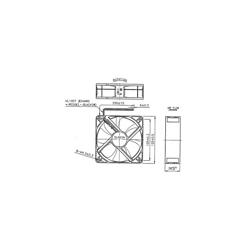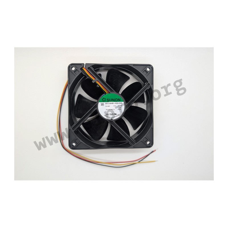 DC fans in a 120x120x38mm housing. These fans have a ball (MEC/EF/EEC_B_-) resp. a vapo bearing system (MEC/EF/EEC_V_-). They have a frame and impellers made of thermoplastic PBT (UL94V-0), are durable and vibration-free. We offer various types of this Sunon series.