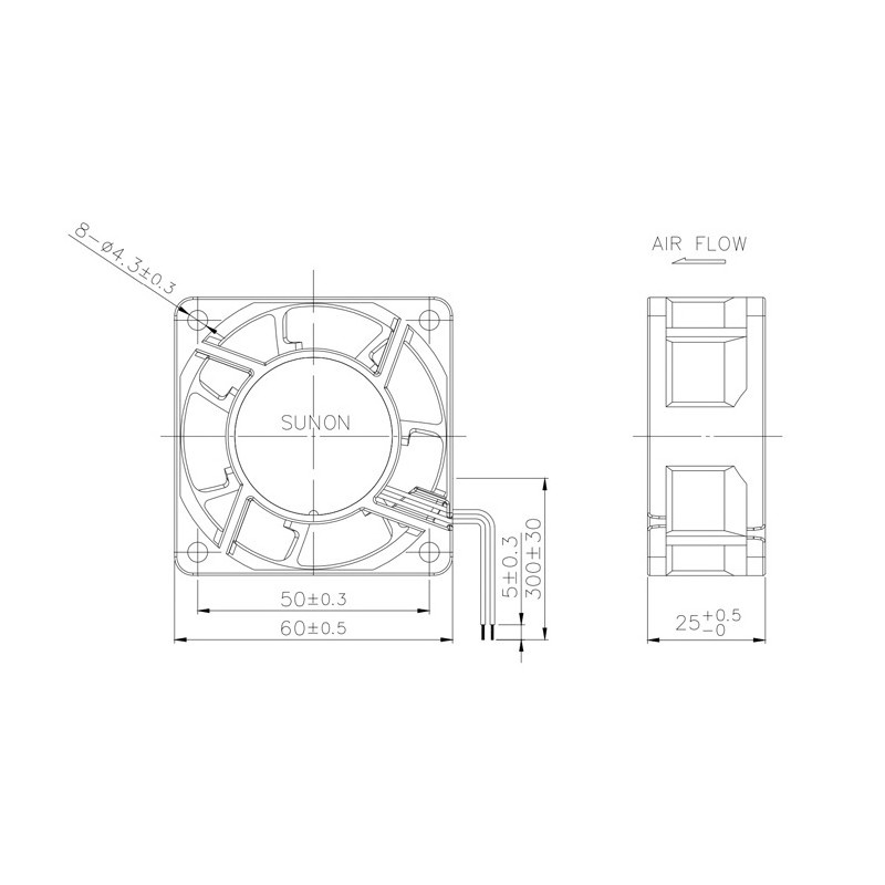 AC fans with either a 4 pole brushless motor (MA_/CF_) or a shaded-pole motor (LFA_) are available. These fans have impedance protection and come equipped with either sleeve bearings (LFA 220V G), ball bearings (LFA 220V K) or vapo bearing systems (MA_/CF_). The impellers of these fans are made from thermoplastic PBT(UL94V-0). Connection to the power supply is through wires, while their operating temperature ranges between -10°C to +70°C. Their dimensions measure at 80x80x25mm and they operate on rated voltage of 230V AC.