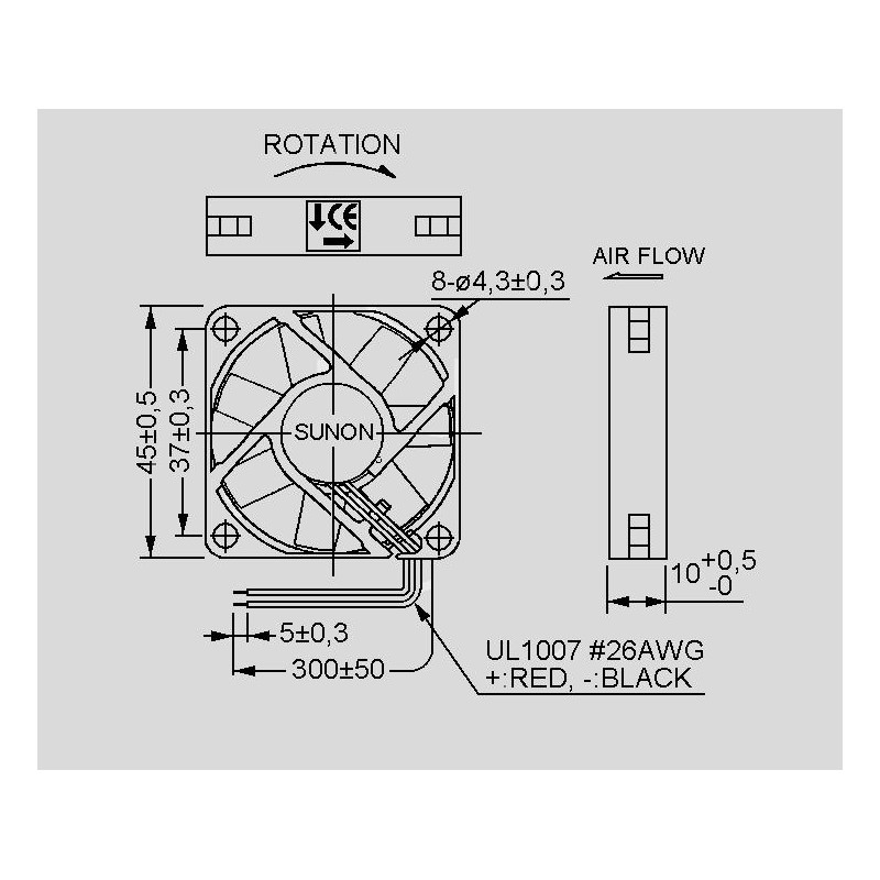 DC fans with a 4-pole axial configuration and vapo bearing system, featuring a Magnetic Levitation System. These fans have connection facilitated by stranded wires UL1007 AWG26 and are manufactured using impellers and frames made of filled thermoplastic PBT (UL94V-0). They come in dimensions measuring 45x45x10mm and are rated for use with 12V DC.