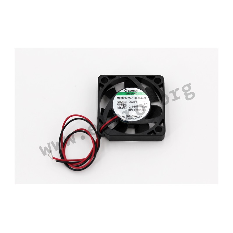 Fans with a size of 30x30x6mm and rated voltage of 5V DC. These fans are equipped with a 4-pole DC motor, vapor bearings and a magnetic levitation system.The impeller and frame are made of thermoplastic PBT (UL94V-0). They are connected through UL1571 AWG28 wires.