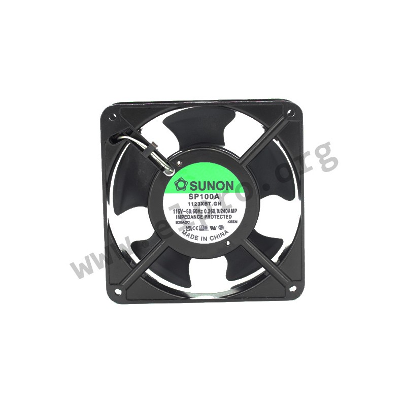 AC fans with a ball bearing system, shaded-pole motor and impedance protection are available from Sunon. These fans have dimensions of 120x120x38mm and feature an aluminium spray cast frame as well as a filled thermoplastic PBT (UL94V-0) impeller. They operate at rated voltage of 115V AC 50/60Hz and can function within the range of operating voltage between 85 to 125V AC. The dielectric strength at 65% humidity is measured to be 1500VAC for one minute while insulation resistance stands greater than 500MΩ when tested using 500VDC. Their operating temperature ranges from -10°Cto+70°C.They come equipped with drilled frames that allow grounding through M4 screw connections.