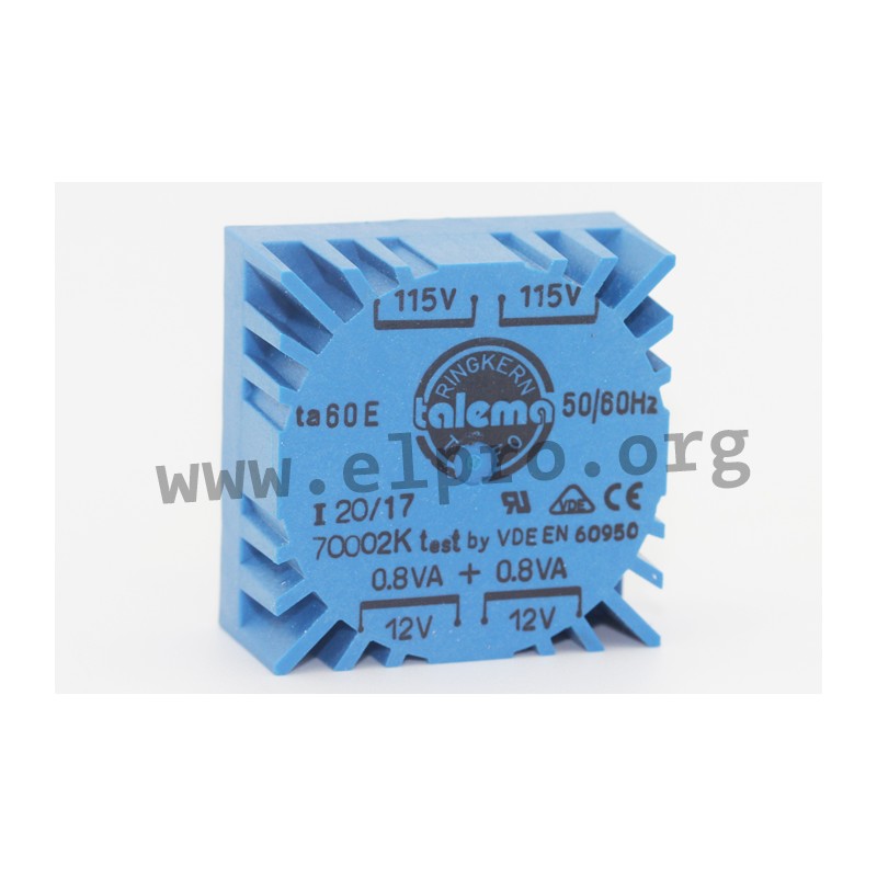 38715 70002K 70002K toroidal print transformers 1.6VA by Talema. • output: 1.6 VA• by Talema• non short-circuit proof• primary winding (50/60Hz): 2x115V AC• efficiency voltage: 77%• no-load current, I0Typ.: 1mA • test voltage (prim./sec.): 4kV• temperature class: T60/E• temperature rise at rated load: 10K• protection, 230V, delayed fuse: 32mA• insulation class: A(105°C): E(125°C)
