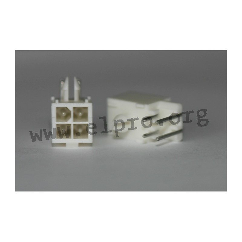 * by AMP/Tyco * series Mini-Universal MATE-N-LOK * angled version for PCB * contact material: CuZn, tinned * pitch: 4.14mm * pin header for plugs with female contacts