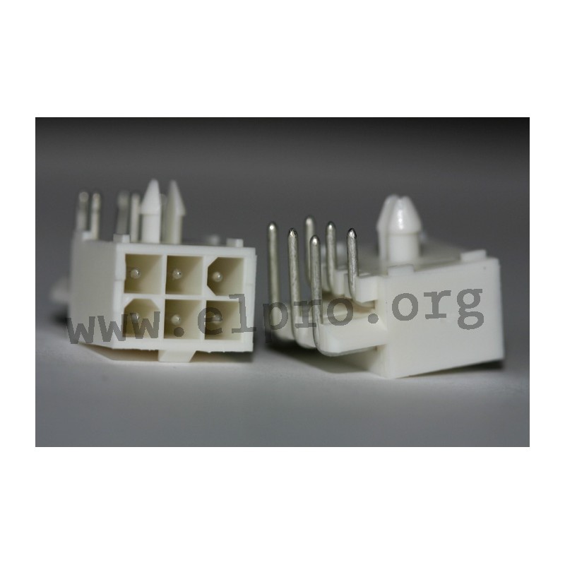 299361-770969-01-770969-0pin headers, 4.14mm. * by AMP/Tyco* series Mini-Universal MATE-N-LOK* angled version for PCB* contact material: CuZn, tinned* pitch: 4.14mm* pin header for plugs with female contacts